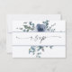 Un hermoso rsvp de boda floral azul polvoriento con flores acuarelas, texto negro junto con un sólido acento blanco y azul polvoriento.