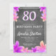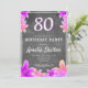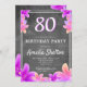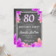 Floral Púrpura Rosa Bellflowers Chalkboard Invitación de fiesta de cumpleaños número 80. Esta invitación de verano florida para el 80 cumpleaños es perfecta para una fiesta de cumpleaños a mitad de verano. La plantilla de invitación floral incluye flores de panza rosadas y violetas en una textura de pizarra gris oscuro. Personalice la invitación con sus datos y cambie o borre cualquier texto de la tarjeta.