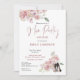 Una flor de flores rosas decora la esquina superior izquierda y un motivo de coordinación en la parte inferior derecha con un elegante par de zapatos de estilete negro parcialmente escondidos por el ramo, y la temática floral continúa en la parte trasera. El encabezado principal Hen Fiesta está en una tipografía de guion rosado rosa y el resto del texto que puede personalizar fácilmente, así como los detalles del itinerario al revés.