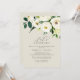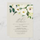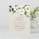Esta elegante champán blanco floral celebramos la invitación y es perfecta para una fiesta de compromiso clásica, boda tras fiesta, retiro, graduación o cualquier evento feliz. El moderno diseño vintage presenta un bonito y romántico rosa de marfil y acuarela crema y flores de peonía con hojas de color verde oscuro, vegetación y productos botánicos.