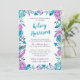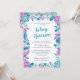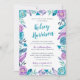 Una invitación a la ducha de bebé con flores con adorable guión de caligrafía. Esta ducha de moda boho ofrece ilustraciones acuáticos pintados a mano, como rosas azules y púrpura, plumas, flechas y vegetación. La paleta de color femenino es perfecta para una ducha de chica o para un chiringuito de chica.