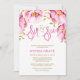 Elegantes invitaciones para brindar y ver para niña en rosa y oro. El diseño presenta flores de acuarela rosadas, hojas de purpurina dorada falsa y una fuente de letra script moderna. Los diseños son ilustraciones/gráficos impresos planos - NO ES PURPURINA REAL.