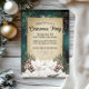 Esta invitación a la fiesta de los Navidades presenta un tema floral de invierno glamuroso y elegante. En la parte inferior del edificio se representan poinsettias blancas, conos de pino y ramas, acentuadas con confetti purpurina plateado. Un marco dorado vintage ornamentado bordea la parte de texto. Los copos blancos de nieve caen sobre un brillante fondo verde de pino.