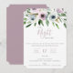 La noche anterior, invitación de celebración. La tarjeta presenta un elegante ramo floral de jardín en tonos elegantes de blanco, mauve y verde. Diseño de tipografía moderno y chic. La parte trasera de la tarjeta, que se muestra en sombras de mauve, se puede personalizar.