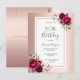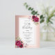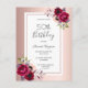 Delante: rosa de moda de color oro falso de aspecto metálico con un sencillo marco de color blanco y oro rosa. Decorado con flores, rosas en burdeos. Plantillas para su nombre y detalles del fiesta. El nombre y el texto: 50º cumpleaños (o cualquier edad) están escritos con un guión de estilo con letras a mano, letras de color gris oscuro. Atrás: fondo de aspecto metálico falso de oro rosa.