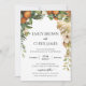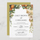 Bonito, elegante, moderna y bohemia invitan a su ocasión especial. Borde foliage de color de agua en hojas oscuras y verdes, con fruta naranja de la naturaleza y flores en miniatura enmarcan la parte superior de los detalles de la celebración boda. Sus nombres aparecen en letra moderna en la parte superior, y tarjeta inversa para revelar un patrón de follaje verde en la parte posterior. Personalizar los detalles de su boda, fecha, lugar y más en la parte delantera.