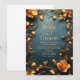 Haga que su boda sea inolvidable con esta invitación lujosa que presenta acentos florales dorados en un elegante fondo de color turquesa. Las flores de oro ornamentadas y las hojas onduladas enmarcan el centro, proporcionando el espacio perfecto para mostrar los detalles de su boda con estilo. Este diseño sofisticado es ideal para parejas que buscan una mezcla de opulencia y romance para su día especial. El texto personalizable le permite personalizarlo para que coincida con el tema de su boda. Perfecto para bodas formales, glamorosas o con tema vintage.