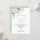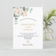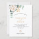 Un fondo blanco moda. Decorada con flores blancas, flores (peones) y hojas de eucalipto de color verde acuático, estribos, vegetación y una falsa primavera dorada. Personalice y agregue sus nombres y detalles del boda. Letras negras y doradas. Color de fondo verde.