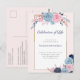 Un diseño floral elegante con rosas en tonos de rosa, azul marino y azul polvoriento, sobre un fondo sonrosado.