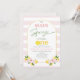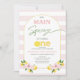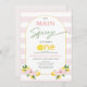 Invitación de primer cumpleaños con tema de limón dulce Floral Pink Lemon Main Squeeze dulce estilo primer cumpleaños para una niña con algunos arreglos florales y limoneros rosados, un patrón rayado rosado y una caligrafía moderna que se dirige a un arco blanco. Esta invitación de primer cumpleaños de apretón principal también incluye una palabra decorativa con una rebanada de limón que huele una.