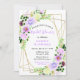 This fun and whimsical bridal shower invitation features watercolor purple flowers and foliage on a gold geometric frame. The text combines handwritten script and serif fonts for a stylish and modern look. This is perfect for a spring or summer rustic bridal shower.