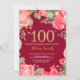 Invitación Floral roja 100 cumpleaños Purpurina de oro Borgoñ