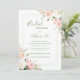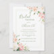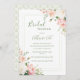 Hermosas flores color rosa pastel y color melocotón que acentúan las esquinas opuestas de esta encantadora invitación a la ducha de novias, fuentes dulces y guiones hechos en colores coordinados invitan a la ducha de novia. Patrón de repetición paisley de color verde dulce descolorido en el lado inverso. Una invitación boda perfecta para novias en cualquier temporada.