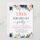 Flores florales rosas azul marino y Rubor y color de agua verde 18ª (decimoctava) Invitaciones a fiestas de cumpleaños incluyen hermosa y elegante tipografía de escritura con flores modernas de color rosa rubí botánico y azul marino para la celebración especial de los dieciocho años.
