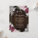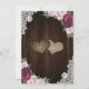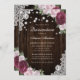 Hermosas invitaciones rústicas burdeos y ruidosas para fiestas florales de quinceañera con flores rojas y rosas de color rosa contra un fondo de madera de granero adornado con encajes florales blancos y luces de cuerda. Arroja corazones con iniciales en la parte posterior. Personalice fácilmente en línea.