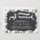 Esta elegante y moderna invitación para el 25º aniversario de boda presenta una encantadora caligrafía a pincel, hermosas flores azules y blancas, tipografía que dice "Acaban de casarse (¡hace veinticinco años!)", y un fondo rústico de pizarra.