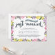 Esta elegante y moderna invitación para el 75 aniversario de boda presenta una encantadora caligrafía a pincel; hermosas flores rosadas, púrpuras y amarillas; y tipografía rústica que dice "Recién casados (hace setenta y cinco años)".