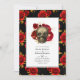Invitación a una boda gótica roja, negra y dorada con un cráneo decorado con rosas rojas y un patrón rosa dramático. La foto al revés es opcional. Si prefiere eliminarla, desplácese hasta la parte inferior de "Personalizar esta plantilla" y haga clic en "Editar usando la herramienta de diseño". En la Herramienta de diseño puede editar, escalar, eliminar o mover cualquier texto o elemento de diseño que desee.