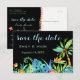 Esta colorida tarjeta postal de "Save The Date" tropical es perfecta para la pareja que tendrá una boda en la playa hawaiana, una boda en la playa de Florida o una boda en la playa del Caribe. Las imágenes de acuarela de hibisco, hojas exóticas, ave del paraíso, flores tropicales, piñas y palmeras sobre un fondo negro adornan la tarjeta en la parte delantera y trasera. Esta invitación presenta azul, verde, rosa, naranja, amarillo y rojo. Personalice el texto para una tarjeta personalizada. ¡Vea mi colección completa "Boda floral tropical" para obtener más artículos que pueda necesitar para su boda tropical exótica!