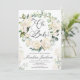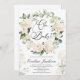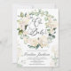 Esta encantadora invitación a la ducha de bebé chica incluye rosas blancas florecientes, hojas de eucalipto fresco y flores de horangea
