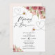 Floral And Hearts Mommy To Bee Baby Shower Invitation chicas con la temática de las abejas dulces con la invitación a una ducha de bebé con dos abejas, líneas de calor y dos arreglos florales. Esta invitación a la ducha nupcial de la mamá también incluye un moderno encabezado de caligrafía.