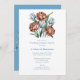 Un ramo de flores muy bien ilustrado. El ramo se compone de grandes peonías vibrantes en tonos terracota y azul, complementadas con pequeños tulipanes azules. También hay hojas verdes y acentos dorados, posiblemente representando tallos u otros elementos florales. Las flores están centralmente colocadas, con un par de anillos dorados entrelazados entre ellas. Toda la composición se sitúa sobre un fondo blanco, destacando los colores y detalles de las flores.