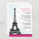 Invitaciones: Invitaciones de recepción de boda parisina elegantes y modernas SOLAMENTE con la Torre Eiffel en escala de grises en la parte superior sobre un fondo de color rosa fucsia con florituras de color azul aqua detrás.