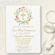 Moderno y elegante acuarela Flores salvajes Wreath First Holy Communion Invitation incluye delicado amarillo, rosa, melocotón, azul polvoriento, verde salvia, violeta, rojo y naranja de flores silvestres, amapolas, hojas de eucalipto y otros hermosos paisajes botánicos. Cruz de Oro.