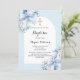 Marco de arco blanco y fondo azul claro. Decorada con flores y arcos azules y blancos. Una cruz dorada. Personalice y agregue un nombre y detalles.
