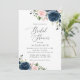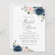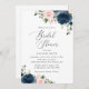 Invite a amigos y familiares con estilo y establezca el tono de su día especial con esta encantadora invitación a la ducha de novia. El diseño presenta flores de acuarela color azul marino y rosa y vegetación sobre fondo blanco.