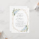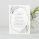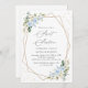 Invite a los amigos y a la familia con estilo y establezca el tono de su día especial con esta encantadora invitación de cumpleaños. El diseño presenta flores de color azul y blanco, vegetación, confeti dorado y marco dorado sobre fondo blanco.