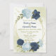 Hermosa invitación a bodas con flores azules polvorientas y hojas verdes sobre un elegante marco geométrico dorado. Los detalles del purpurina de oro se simulan. Es adecuado tanto para bodas como para invitaciones de compromiso. PARA OBTENER MÁS PRODUCTOS COINCIDENTES, haga clic en la colección de arriba o póngase en contacto conmigo