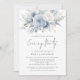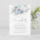 Dusty Blue Florals Foto en la parte de atrás, Boda de código QR Fiesta de la noche. Los hermosos florales azules claros de verano están en la cima. Agregue su código QR al sitio web de su boda en la parte posterior o borre esto si no es necesario. Simplemente cambie la URL a la URL de la página elegida de su sitio web boda y el código QR de este diseño se actualizará automáticamente. Una tipografía de conjunto informal en negro para el principal título Fiesta de la noche complementando el resto del texto que se puede personalizar fácilmente. Reemplace la imagen de ejemplo en la parte posterior por la suya propia.