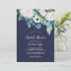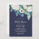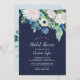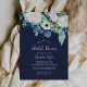 Esta clásica invitación a la ducha con flores blancas de la marina es perfecta para una ducha de boda en otoño. El elegante diseño floral incluye roses blandas de marfil y blanco, peonías y crisantemo con toques de flores de acuarela azul perwinkle y follaje verde sobre un fondo azul oscuro.