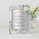 Fondo de color plateado falso decorado con flores blancas, flores, vegetación eucaliptos y purpurina de plata falsa, chispas. Personalice y agregue su nombre y detalles del fiesta. Cartas negras.
