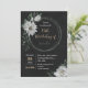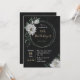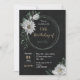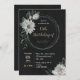 Invitación única para fiestas de cumpleaños con flores blancas románticas y hojas verdes sobre fondo negro. PARA OBTENER MÁS PRODUCTOS COINCIDENTES, haga clic en la colección superior o póngase en contacto conmigo.