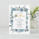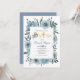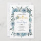 Flores de acuarela azul turbia bautizo invitación floral. Este bonito diseño presenta un marco floral de flores azules polvorientas y hojas suculentas y tu texto. La palabra "bautismo" está en oro en una fuente decorativa con un ramo de flores mientras que el nombre del niño está en tipografía de escritura. En lugar de la letra "I" en la palabra "Bautismo" hay una cruz purpurina de oro.