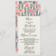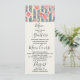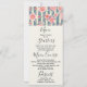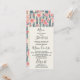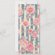 Tarjeta de menú con un hermoso patrón que presenta hermosas flores rosadas superpuestas sobre un patrón de rayas compuestas por rayas azules y crema.