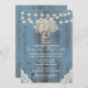 Flores de aliento de bebe vintage agitan ruidosas invitaciones de boda a ritmo de madera azul en el Barn Azul.