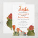 En la parte inferior, hay pinturas en acuarela de 3 flores de cactus diferentes: cactus erizo, cactus cojín y Opuntia Basilaris. El título "Fiesta" y el nombre están escritos en una escritura a mano de color rojo-naranja (coral) similar en color a las flores de cactus, las palabras "Baby Shower" son del mismo color, pero escritas en mayúsculas.