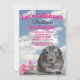 Aquí hay un lindo conejillo de indias gris con pequeñas flores rosadas en una roca sentado bajo un cielo azul parcialmente nublado en la parte delantera de esta plantilla diseñada para la invitación a una fiesta de tercer cumpleaños de un niño con tarjeta plana. Personalice los campos de texto o haga clic en personalizar para seleccionar un estilo de tipo de letra, color y tamaño que desee. Si te gusta, póngalo en el teclado para encontrarlo más tarde.