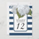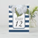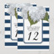 Números de mesa para su ducha de novia, fiesta de cumpleaños, recepción de boda u otro evento formal. Las hortensias blancas pintadas a mano se emparejan con un patrón de rayas anchas modernas en azul marino y blanco con un contorno de brillo plateado diminuto. Un marco con esquina entallada inspirado en el art déco termina el diseño. derechos de autor, Audrey Jeanne Roberts.
