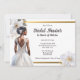 Una hermosa acuarela mujer afroamericana / melanina con la espalda hacia ti mira hacia atrás sobre su hombro y está enmarcada por un fondo blanco que tiene flores florales blancas en las esquinas superior e inferior y una falsa banda horizontal dorada. Lleva un exquisito vestido de boda blanco que tiene detalles de encaje y una espalda abierta. Su cabello está barrido en un elegante bollo adornado con una banda blanca de encaje y lleva delicados pendientes de diamante para acabar con su elegante apariencia. Las plantillas negras aparecen a su derecha para la redacción de su personalizado. Este diseño es ideal para las elegantes, sencillas duchas florales o botánicas blancas y falsas duchas de novias doradas. Siéntase libre de cambiar el fondo y el color del tipo de letra a cualquier color que elija para su ocasión especial.
