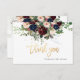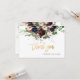 Tarjeta de agradecimiento plana con flores acuáticas de color azul marino burdeos, ramos colgantes de eucalipto azul goma azul. Esta carta está acentuada con un guión moderno escrito a mano, gracias en oro falso. Copyright © 2016-2020 Bombino Designs™.