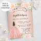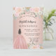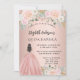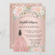 Una invitación moderna, elegante y glamurosa para una fiesta de 15 años en Quinceañera. Un fondo dorado rosa con flores rosadas de color, un chica vestido de bata de bolas. El nombre está escrito con una escritura de estilo con letras a mano moderna. Personalice y agregue los detalles de su fiesta.