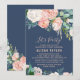 Esta tarjeta de invitación de flores de peonía románticas para una fiesta azul es perfecta para un evento elegante. El diseño floral presenta flores de acuarela en cascada de color rosa, melocotón y blanco sobre un fondo azul marino.