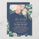 Esta tarjeta de invitación de flores de peonía románticas es perfecta para un evento elegante. El diseño floral presenta flores de acuarela en rosa claro, melocotón y blanco que caen en cascada sobre un fondo azul marino.