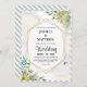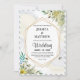 Invitación elegante y sencilla con flores de verano, y rosas amarillas en un marco dorado. Abejas como detalle decorativo. Fondo de acuarela con manchas de gris claro y blanco, y en los bordes franjas diagonales grises