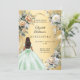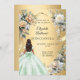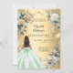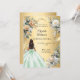 Un falso fondo dorado. Decorada con flores blancas y amarillas, vegetación de salvia y cinta dorada. Un chica con una tiara y un vestido verde. Personalice y agregue un nombre y detalles.