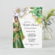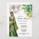 Una hermosa acuarela de una novia india usando un vestido de traje de novia dorado y verde con adornos de oro y un velo largo. Está parada debajo de una sola flor blanca y una única flor verde en plena flor, ambientada en un fondo blanco. La escritura de caligrafía negra y las plantillas negras de estilo romano aparecen a su derecha para la redacción de su personalizado. Este diseño es ideal para las duchas rojas y doradas, elegantes y sencillas, florales o botánicas. Siéntase libre de cambiar el fondo y el color del tipo de letra a cualquier color que elija para su ocasión especial.